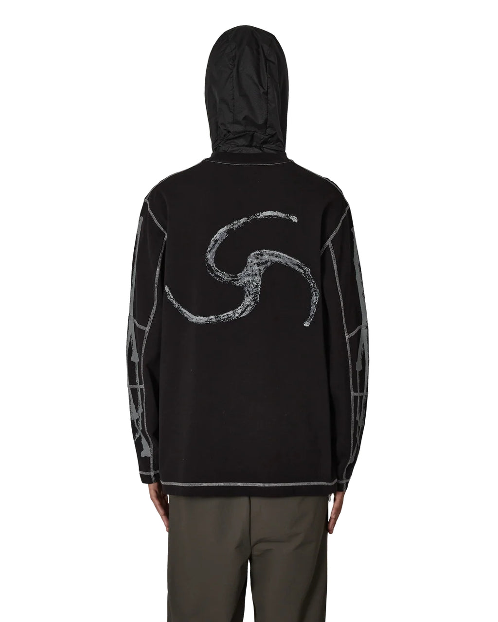 T-shirt grafica a manica lunga realizzata in jersey di cotone biologico pesante, colore nero. Stampa a contrasto sul davanti e stampa sul retro nei colori argento, moon mist e peltro. Colletto a costine.
